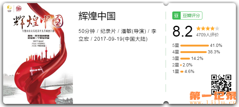 ◎译 名 Amazing China ◎片 名 辉煌中国 ◎年 代 2017 ◎产 地 中国大陆 ◎类 别 纪录片 ◎语 言 汉语普通话 ◎上映日期 2017-09-19(中国大陆) ◎IMDb链接 https://www.imdb.com/title/tt12101482 ◎豆瓣评分 8.2/10 from 5313 users ◎豆瓣链接 https://movie.douban.com/subject/27141911/ ◎集 数 6 ◎片 长 50分钟 ◎导 演 潘敏 Min Pan ◎主 演 李立宏 Lihong Li 高佑思 Raz Galor ◎标 签 纪录片 | 中国大陆 | 发展 | 2017 | 政治 | 经济 | 工程 《辉煌中国》是由中共中央宣传部、中央电视台联合制作的六集电视纪录片。全片以创新、协调、绿色、开放、共享的新发展理念为脉络,全面反映党的十八大以来中国经济社会发展取得的巨大成就。 第15届中国(广州)国际纪录片节(2017) “金红棉”国际纪录片评优单元 组委会特别推优纪录片 第4届豆瓣电影年度榜单(2017) 评分最高的纪录剧集(提名)